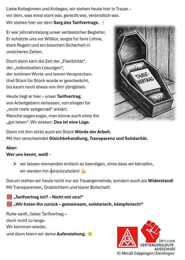 Liebe Kolleginnen und Kollegen, wir stehen heute hier in Trauer –vor dem, was einst stark war, gerecht war, verbindlich war.Wir stehen hier vor dem Sarg des Tarifvertrags.